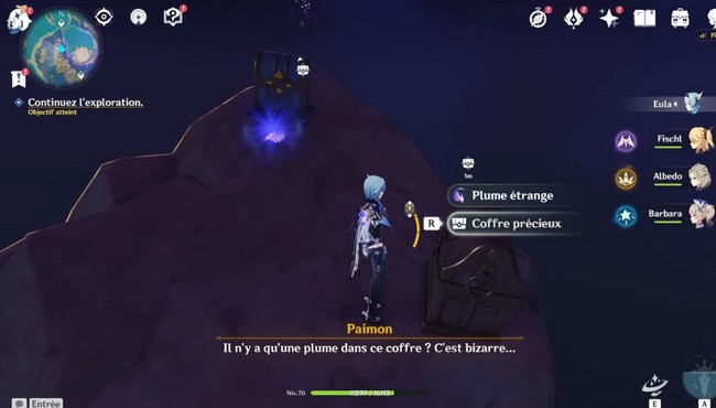 Une fois que vous aurez atteint le sommet, vous trouverez une plume étrange. C’est la cause profonde de l’anomalie de la tempête sur l’île de Seirai. Récupérez la plume, le coffre précieux et luxueux à proximité.