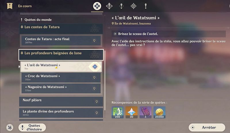 Après la fin de la quête Coeur de Watatsumi, la quête Les profondeurs baignées de lune sera marquée comme terminée.