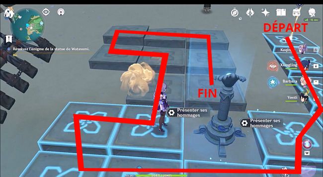 Après avoir éclairé les statues, vous pourrez présenter vos hommages à la statue dont la tête ressemble à un coquillage pour faire apparaitre la dalle qui manquait pour continuer.
