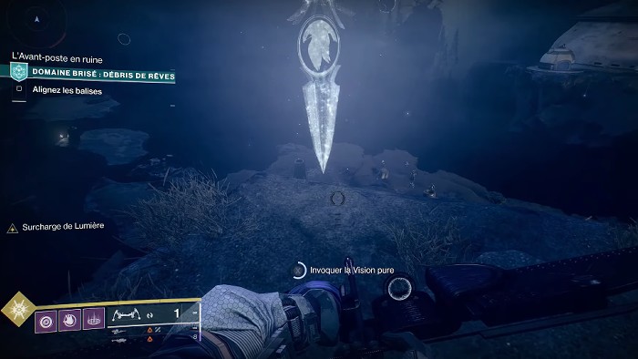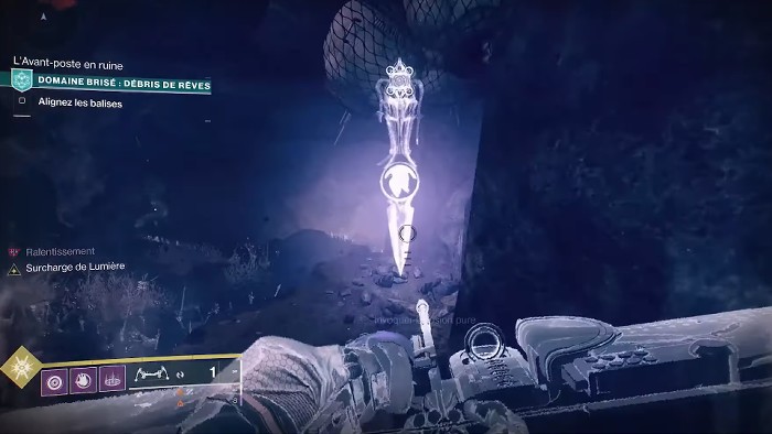 Le premier Mystère énigmatique requiert que vous possédiez l’amélioration Vision pure de la Boussole du Chemineur. Vous l’obtiendrez en terminant la deuxième semaine de la quête voyage du Chemineur, donnée au CIMU. Une fois l’amélioration achetée, rendez-vous dans le Domaine brisé : Débris de rêves et alignez la première balise comme vous le feriez normalement. Après avoir terminé, sortez de la structure circulaire et faites face au grand bâtiment d’où vous venez sur la droite. Vous devriez voir un grand ventilateur métallique.