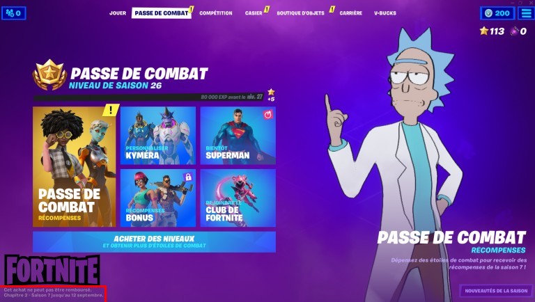La saison 7 de Fortnite Chapitre 2 se terminera le 12 septembre 2021, avec le passe de combat actuel et les défis hebdomadaires de Fortnite qui se terminent comme prévu. L’information est disponible sur le Passe de combat, vous pouvez la trouver en bas à gauche de votre écran au sein du jeu.
