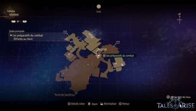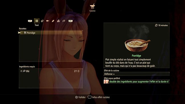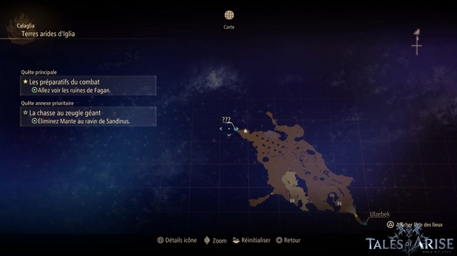 La zone suivante se situe entre Ulzebek et les ruines de Fagan. C’est une zone très étendue avec quelques coffres au trésor et des points de rassemblement, dont un hibou de Dahna tout en haut de l’échelle. Lorsque vous êtes prêt, dirigez-vous vers le feu de camp indiqué sur la carte pour regarder une scène et débloquer la cuisine. Pour l’instant, vous ne pouvez faire que du Porridge.