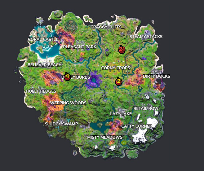 La plupart des pommes se trouve entre Corny Crops et Steamy Stacks. Pour vous aider à trouver une pomme dans Fortnite, utilisez la carte ci-dessous :