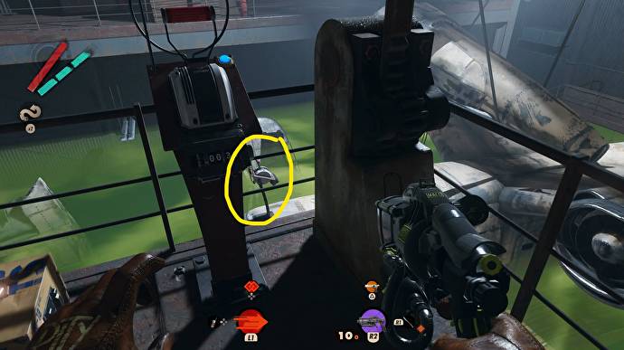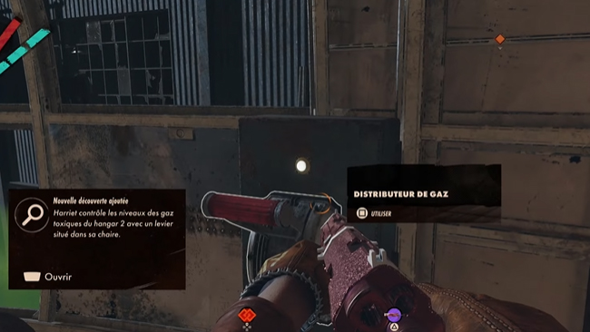 Si vous voulez éliminer un élément de danger et dissiper le gaz, prenez à gauche par la porte de Harriet (ou utilisez la Transposition à travers les lasers) puis descendez les escaliers et à droite il y a un levier sur la droite qui dissipe le gaz vert.