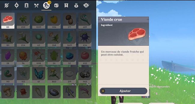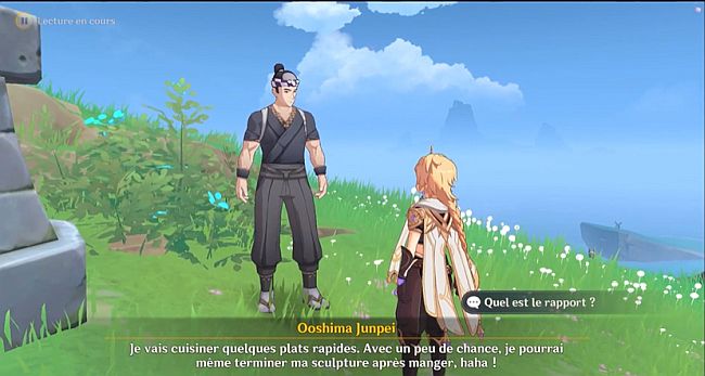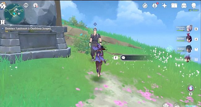 Suivez le marqueur de quête pour parler à Oashima Junpei : Il va vous dire qu’il a faim. Donnez-lui le poisson. Il va vous remercier, mais il va vous dire qu’il préfère encore aller chercher quelque chose tout seul. Il n’a mangé que du poisson pendant plusieurs jours d’affiliée, il peut pas en manger davantage. Il va vous demander de lui apporter 3 morceaux de viande crue.