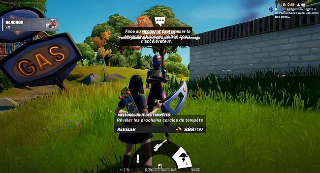 Pour valider ce défi, vous devez avoir 170 lingots d’or pour pouvoir acheter la fonction « Météorologue de la tempête » auprès du personnage Asphalte ! Cette fonction révèle les prochains cercles de tempête.