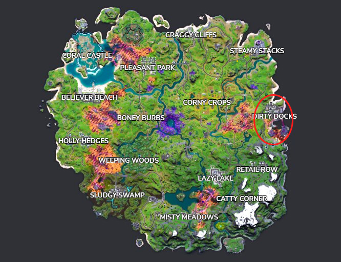 Dirty Docks est l’un des lieux d’intérêt dans Fortnite. Vous trouverez l’emplacement exact de Dirty Docks sur la carte ci-dessous :