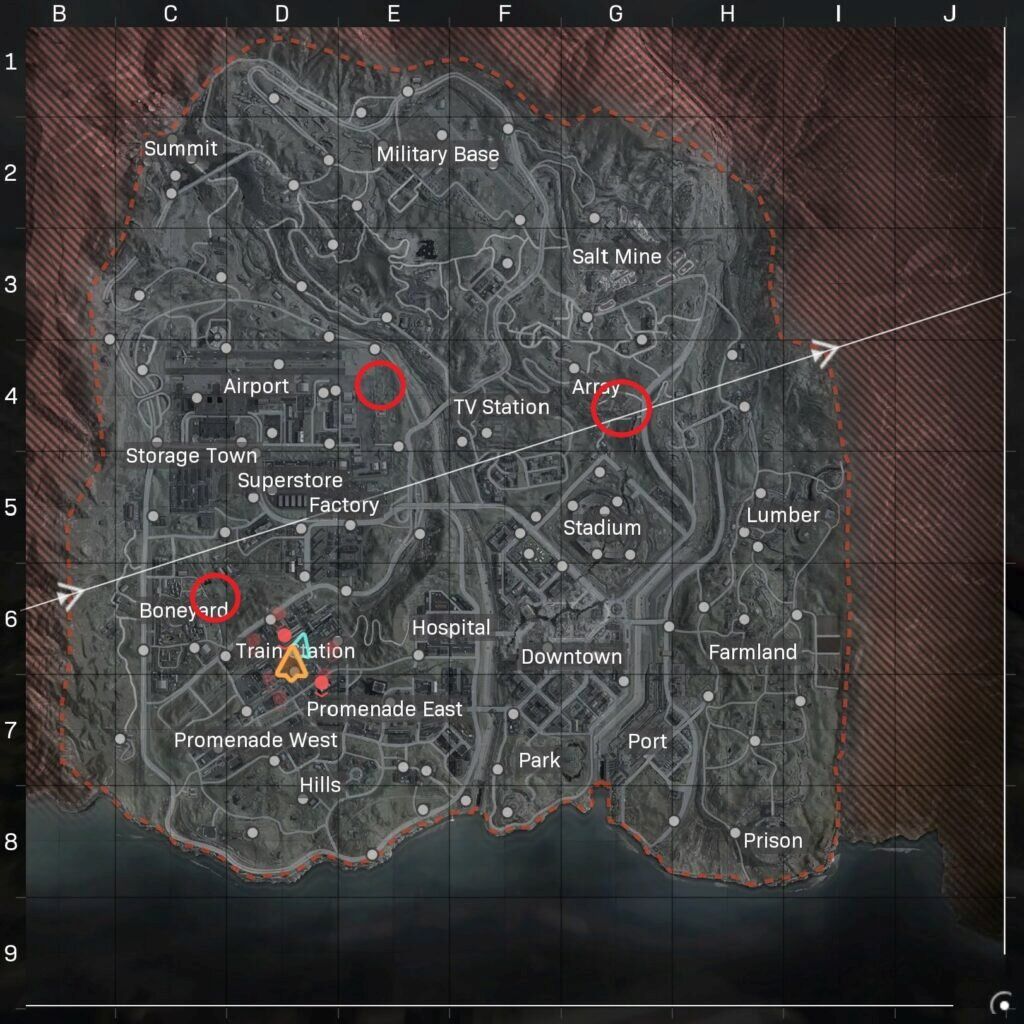 Vous trouverez ci-dessous la carte de la saison 6 de Warzone avec tous les emplacements de bunkers marqués d’un cercle rouge. Il vous suffit de vous rendre dans ces endroits et de vous diriger vers les conteneurs d’expédition rouges pour accéder aux nouveaux bunkers de la Seconde Guerre mondiale.