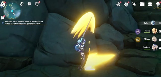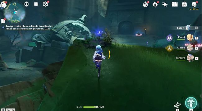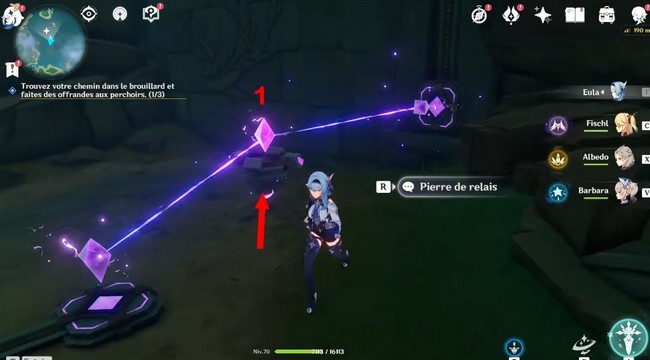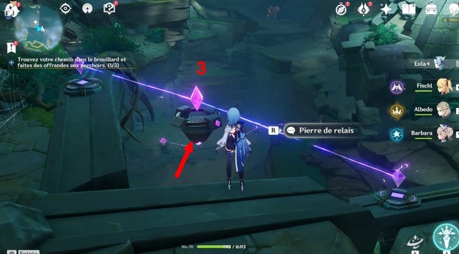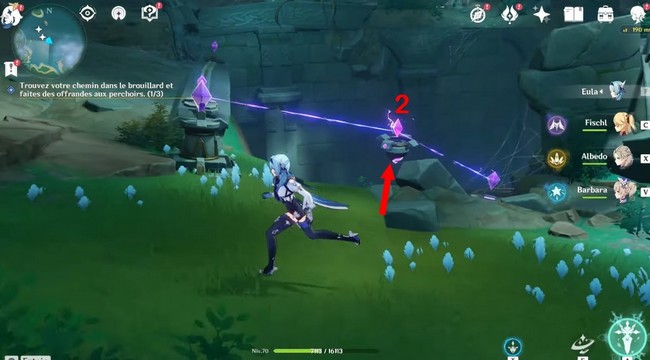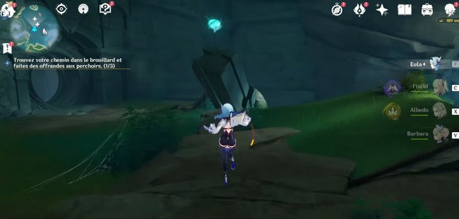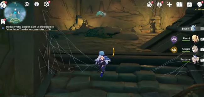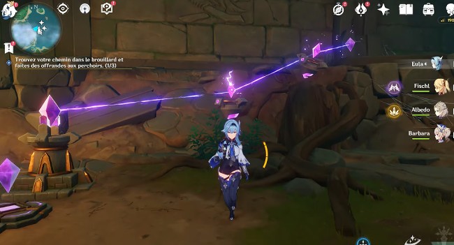 Ce perchoir est assez facile à atteindre, mais vous devrez tout de même vous méfier du brouillard. Vous devez inclure un personnage Electro dans votre groupe, comme Fischl ou Kujou Sara. Je vous recommande l’un de ces deux-là car ils peuvent facilement déclencher des réactions élémentaires électro par Tir chargé grâce à leur statut de personnages d’arc.