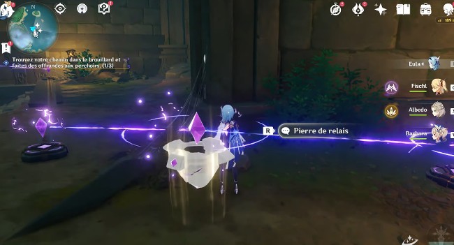 Après avoir entré par cette porte, vous atteindrez des ruines souterraines où vous devrez à nouveau résoudre une énigme de fées pour drainer l’eau. Les deux premières fées sont très faciles à repérer avec la Vue élémentaire, mais la troisième est cachée derrière des rochers que vous devrez briser avec un personnage Geo ou Claymore. Vous pouvez voir où se trouvent les trois fées .
