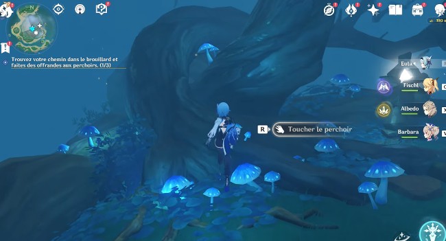 Ce perchoir est assez facile à atteindre, mais vous devrez tout de même vous méfier du brouillard. Vous devez inclure un personnage Electro dans votre groupe, comme Fischl ou Kujou Sara. Je vous recommande l’un de ces deux-là car ils peuvent facilement déclencher des réactions élémentaires électro par Tir chargé grâce à leur statut de personnages d’arc.