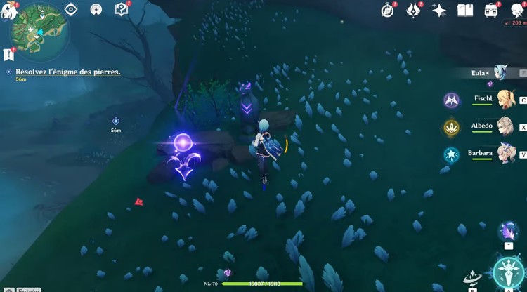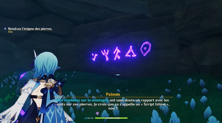 Après avoir parlé à « Ipe », des scripts Ishine violets apparaîtront sur les pierres à l’avant. A gauche des pierres, vous trouverez une statue violette comme indiqué ci-dessous. Utilisez la plume étrange sur la statue violette.