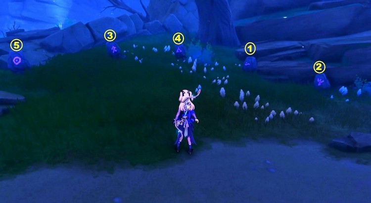 Retournez maintenant vers les pierres sur lesquelles se trouve le script Ishine. Puis frappez les pierres dans le même ordre que les scripts sur la montagne. Ceci complètera le puzzle.