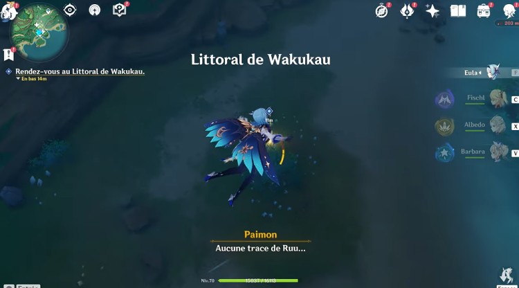 Depuis le site cérémoniel, suivez le marqueur d’objectif vers le sud pour atteindre le Littoral de Wakukau. Utilisez le gadget La plume étrange sur la statue violette comme indiqué ci-dessous.