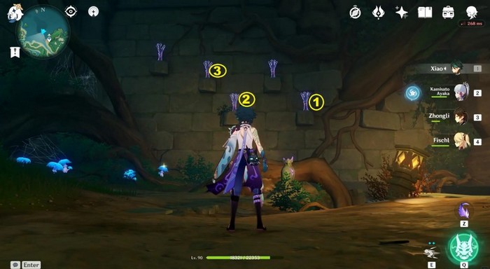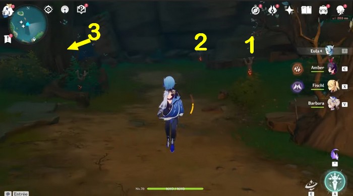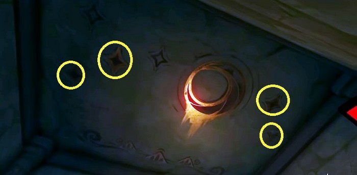 Dans la pièce secrète, vous verrez quelques torches sur le mur. Allumez les torches montrées ci-dessous en les frappant avec une attaque pyrotechnique. L’indice pour cette énigme sera sur le plafond de cette pièce. En résolvant l’énigme, un coffre apparaîtra.