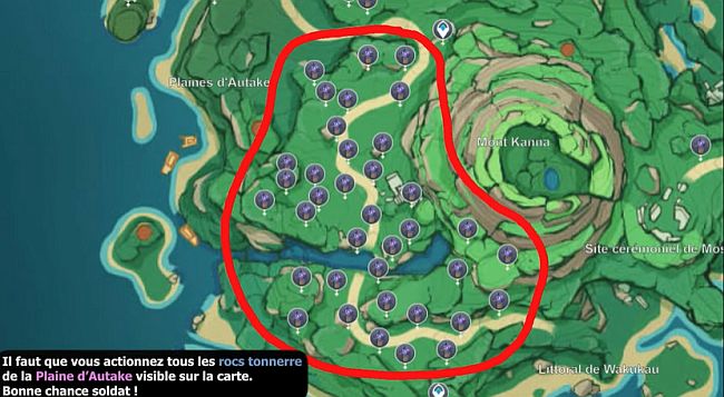 Vous devez actionner tous les Rocs tonnerre de la Plaine d’Autake : y compris les 3 Rocs tonnerre cachés par la statue.