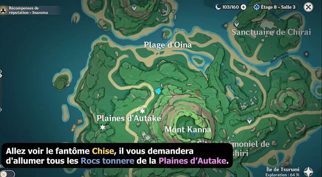 Allez voir le fantôme Chise, il vous demandera d’allumer tous les Rocs tonnerre de la Plaines d’Autake.