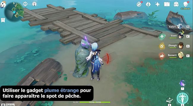 Utiliser le gadget Plume étrange pour faire apparaître le spot de pêche.