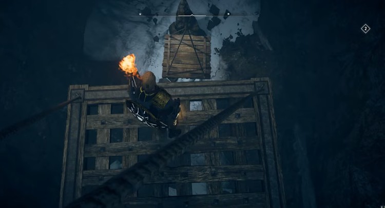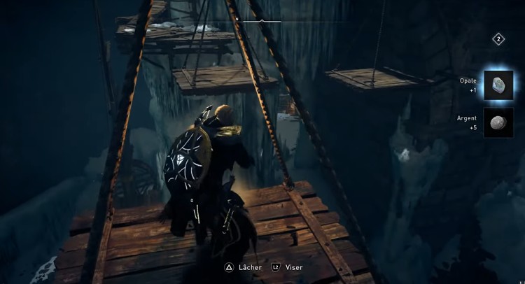 La zone suivante commence de manière similaire à la précédente. Sur le côté gauche de la chambre, vous devrez sauter sur diverses plateformes pour vous rendre de l’autre côté du pont, puis tirer sur les cordes pour le faire tomber.