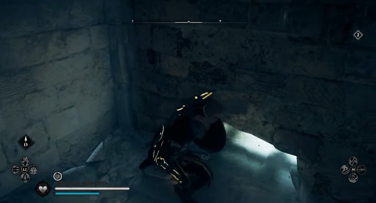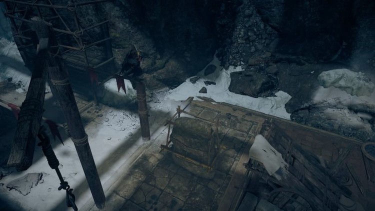 Une fois que vous avez ouvert la porte verrouillée, continuez à travers la tombe, et finalement, vous plongerez à travers le bas d’un mur cassé jusqu’à votre prochaine plaque de pression. Cependant, en traversant la zone, vous serez bloqué par une plateforme. Passez par l’entrée ouverte, suivez le chemin vers la gauche, et atteignez le haut de la pièce. Il y aura un grand objet que vous pourrez pousser sur une plateforme de l’autre côté, ce qui soulèvera la plateforme et ouvrira votre chemin.