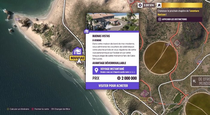 Pour débloquer la possibilité du voyage instantané n’importe où sur la carte, vous devrez acheter la propriété Buenas Vistas en débloquant d’abord le Festival Horizon dans la région de Baja avec la somme de 2 millions de crédits. C’est beaucoup, mais cela vous permettra d’obtenir le Voyage Instantané sur toute la carte.