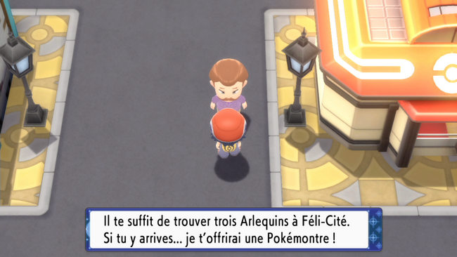 - Une fois que vous aurez commencé le jeu et obtenu vos Starters, vous devrez vous rendre à Féli-Cité. Dirigez-vous vers le nord pour trouver un PNJ. Parlez avec lui et il va demander de trouvez trois Arlequins cachés dans la ville et vous devez répondre correctement à leur question
