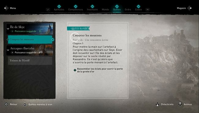 Après l’embuscade dans la grotte d’or, vous apprendrez qu’il vous faut 5 éclats pour ouvrir la porte de la grotte d’or. Ces éclats se trouvent sur l’île de Skye à certains endroits. Pour terminer ce chapitre, vous devez trouver tous les éclats sur l’île.