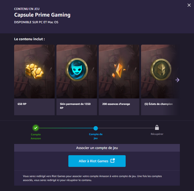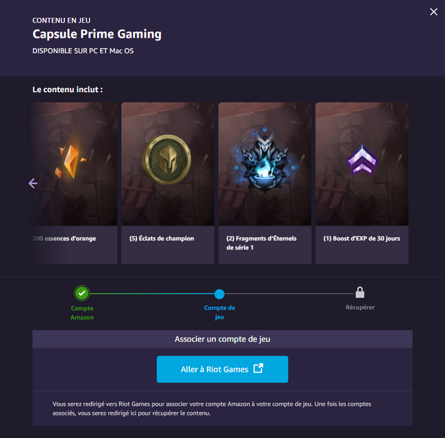 Si votre compte League est lié à Prime Gaming, le bouton « Terminer la récupération » placera le pack dans votre inventaire en jeu. Si ce n’est pas le cas, vous serez invité à connecter les deux comptes et pourrez alors réclamer les articles pour les utiliser dans le jeu.