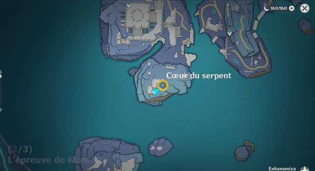 Rendez-vous au cœur du Serpent à Enkanomiya – et assurez-vous que la nuit sans fin est actif. Vous trouverez l’ombre d’Eboshi, près du point de passage rapide au nord-ouest du cœur du Serpent.