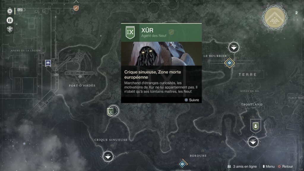 Si vous êtes nouveau dans le jeu, Xur est un personnage qui vend des armes et armures exotiques pendant le week-end. Il apparaît à 17 heures GMT (18 heure de paris) dans un endroit apparemment aléatoire et propose des équipements rares en échange d’éclats légendaires que vous pouvez collecter en démontant des équipements légendaires ou en accomplissant des activités.