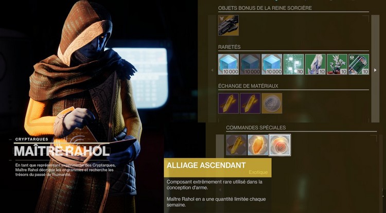 L’emblématique Cryptarques Maître Rahol a désormais des marchandises en réserve pour les Gardiens, notamment un Alliage ascendant par compte chaque semaine. Il coûte 400 éclats légendaires, ce qui est loin d’être bon marché.