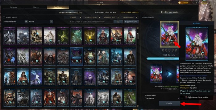 Pour éveiller vos cartes, rendez-vous dans votre catalogue de cartes (Alt+C) et sélectionnez l’onglet Améliorer.