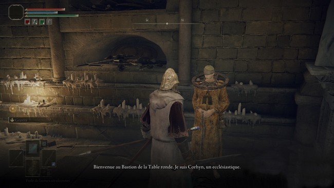 Après quelques heures de jeu et avoir affronté Margit le Déchu puis avoir été emmené au Bastion de la Table Ronde par Melina, vous rencontrez Corhyn.Vous devez répondre positivement à sa question pour qu’il vous ouvre son magasin.