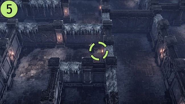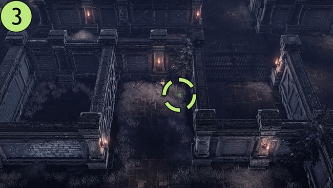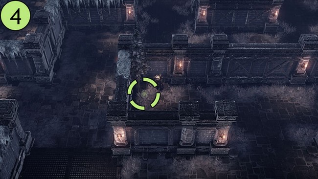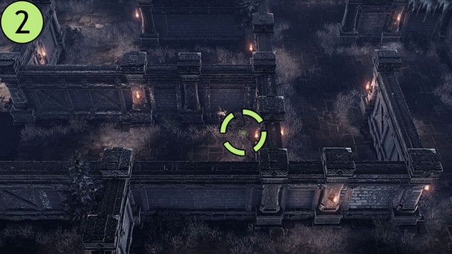 • Après être arrivé dans le camp en haut à droite, dirigez-vous vers le sud. Une grande torche près du mur vous guidera vers la première graine de Mokoko.
