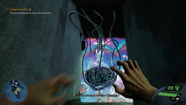 Pour échapper à la barrière, vous devez trouver et détruire trois pierres de barrière cachées dans le complexe d’appartements qui alimentent la barrière. Dirigez-vous vers la cage d’escalier voisine et montez-y. Ici, vous devriez trouver la première pierre de barrière. Détruisez-la pour abaisser la barrière.