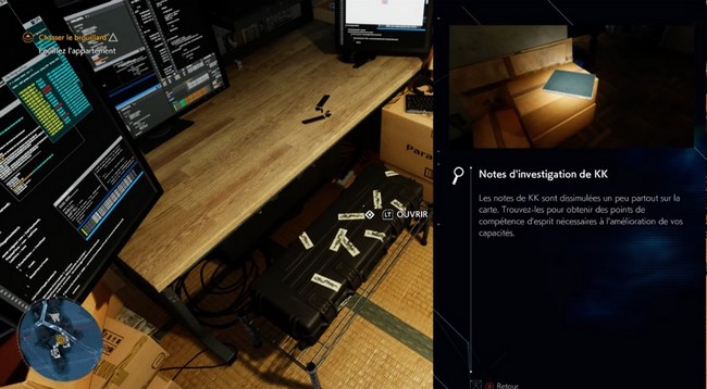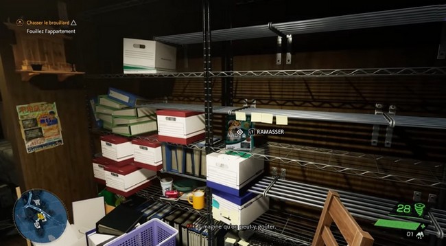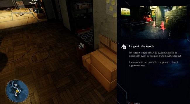 - Note d’investigation de KK – « Le gamin des égouts » sur la boîte à côté de la porte de la kitchenette.