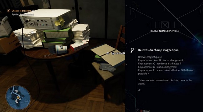 - Dossier – « Relevés du champ magnétique » sur la chaise près de la table au centre de la pièce.