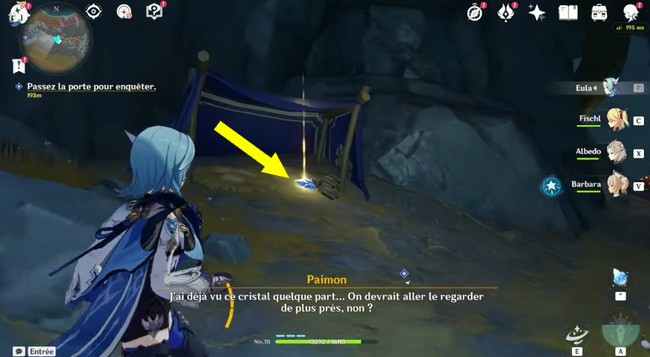 Entrez à l’intérieur de la porte et enquêtez à plusieurs endroits. Le premier est près d’une pile de livres sous une tente et un autre près d’un rocher avec une étrange photo de fossile. Nous avons indiqué les deux emplacements ci-dessous. Continuez votre voyage à l’intérieur de la grotte jusqu’à ce que vous atteigniez le point de téléportation. À cet endroit, vous trouverez un grand cristal.