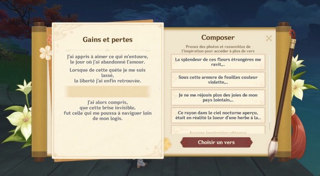 Il vous sera demandé de choisir un vers pour compléter le poème. Vous pouvez compléter le poème comme vous le souhaitez ! Votre vers préféré n’a aucun effet sur la récompense, vous n’avez donc pas à viser une spécialité locale spécifique.