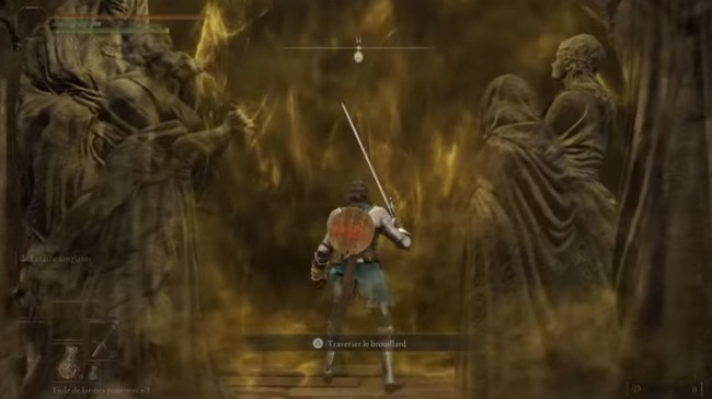 Vous verrez le redoutable brouillard du boss qui recouvre la porte au bout de ce couloir. Entrez dans cette zone, et le combat contre le boss Elemer du Roncier commencera.