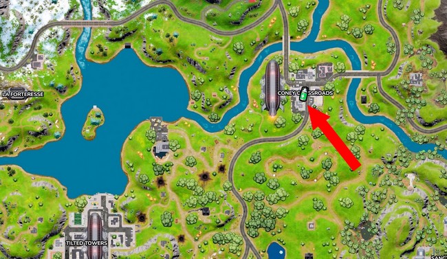 Avec le Médibrume en main, entrez dans la zone de conflit de Fortnite. Pour l’instant, le lieu de combat actif est Coney Crossroads. Vous pouvez savoir quel lieu de combat est actif grâce au texte rouge et au X sur la carte.