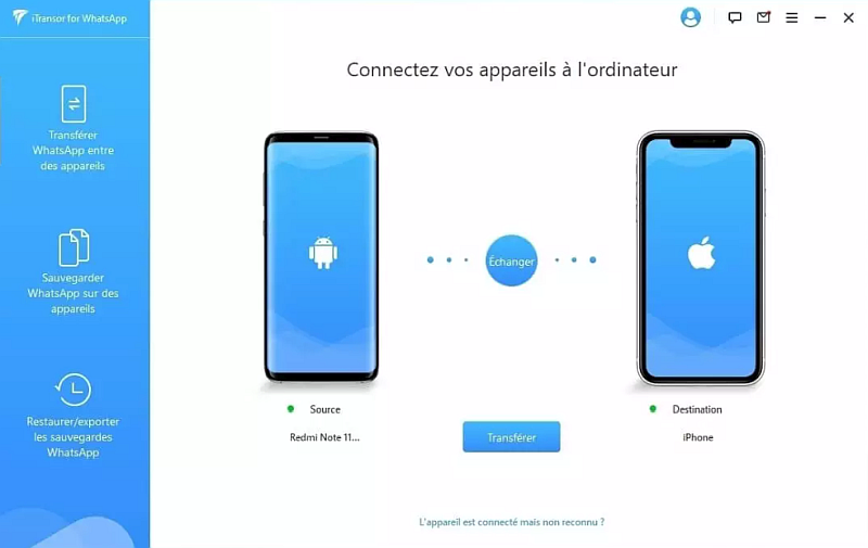 iMyFone iTransor for WhatsApp est un outil pour Windows et macOS qui permet de transférer tous les types de données WhatsApp – y compris les messages, les photos, les vidéos et les fichiers – entre deux smartphones, même avec des systèmes d’exploitation différents. Il vous permet également de sauvegarder l’historique de vos messages et de vos fichiers sur votre ordinateur.