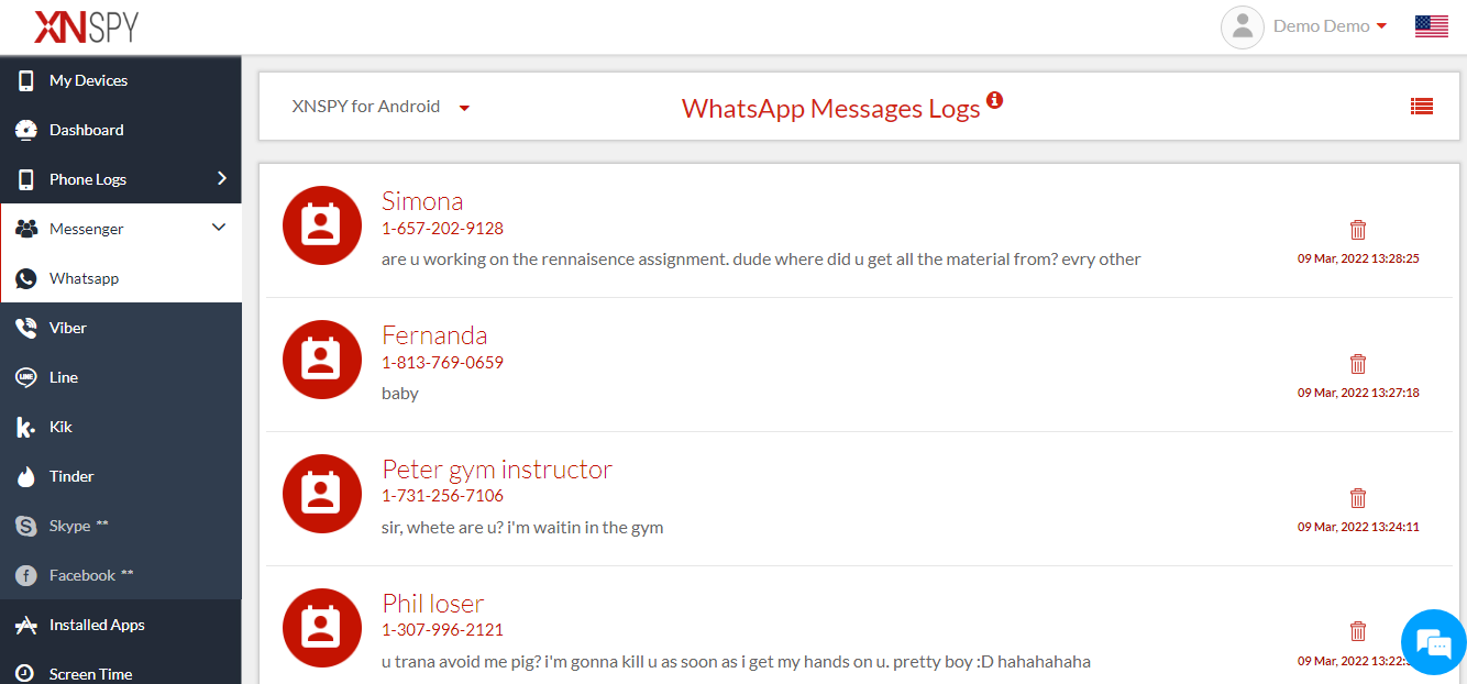 - Pour suivre les chats de messagerie instantanée de quelqu’un, cochez « Xnspy pour Android » et accédez au « Tableau de bord ». Dans le menu déroulant (épinglé sur le côté droit de l’écran), sélectionnez « Messenger », puis une application de messagerie de votre choix. Toutes les données enregistrées seront affichées sur le côté droit de l’écran avec la date et l’heure.