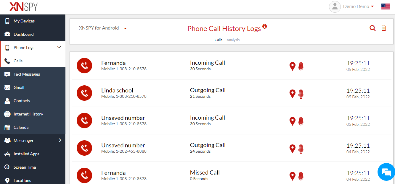 - Utilisez l’onglet de menu pour naviguer dans votre tableau de bord Xnspy pour les journaux téléphoniques pertinents.