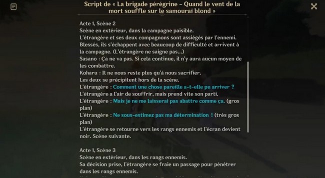 Téléportez-vous au point de téléportation au sud de la Cité d’Inazuma et dirigez-vous vers l’est pour lire le script de « La brigade pérégrine – Quand le vent de la mort souffle sur le samouraï blond »