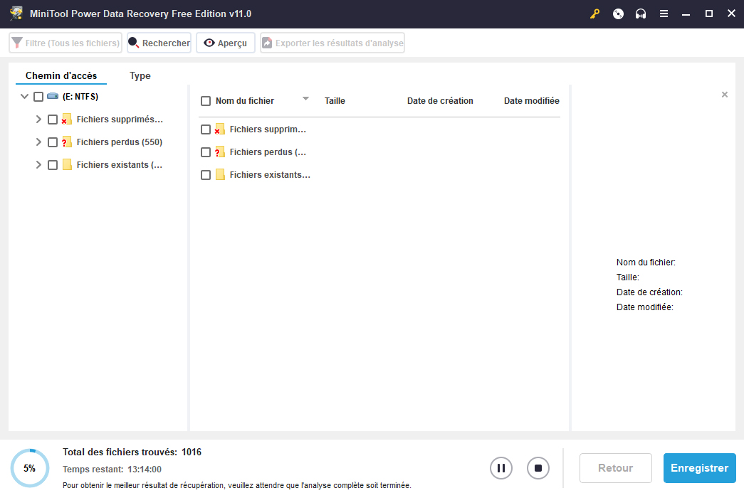Au fur et à mesure que l’analyse progresse, vous pouvez examiner les fichiers déjà trouvés et les prévisualiser (la fonction de prévisualisation n’est pas incluse dans l’installation de base et doit être installée après avoir cliqué sur l’option Prévisualisation). En bas à gauche, une barre de progression indique le degré d’avancement de l’analyse et la durée estimée de l’analyse.
