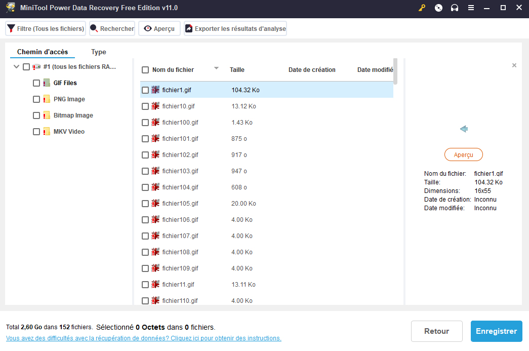 La fonction Rechercher peut être utilisée pour effectuer une recherche par nom de fichier. Si vous n’êtes pas sûr du nom du fichier, ou si vous devez récupérer plusieurs fichiers, le filtre avancé peut être utilisé pour organiser les résultats en fonction de l’extension, de la taille et de la date de création/dernière modification. Vous pouvez également le personnaliser pour n’afficher que les fichiers supprimés, perdus ou normaux.