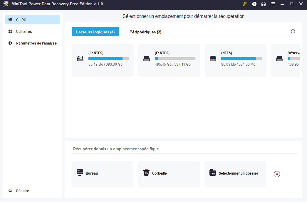 MiniTool Power Data Recovery possède une interface attrayante qui facilite la sélection des sources. Vous pouvez choisir d’analyser des partitions spécifiques ou des lecteurs entiers en basculant entre les deux onglets en haut. En survolant l’un d’entre eux, vous verrez apparaître le bouton Scan, qui lancera immédiatement une analyse une fois cliqué.