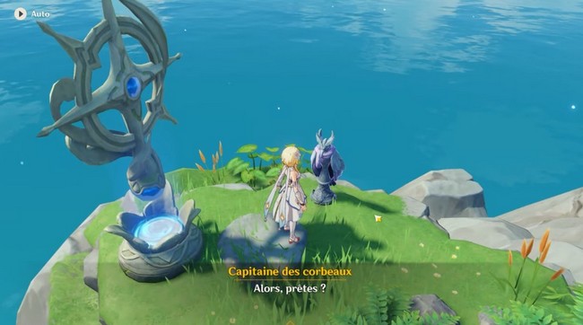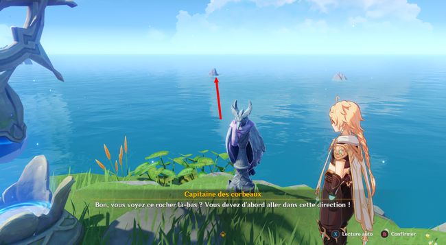 Utilisez la barge pour vous rendre à l’endroit indiqué au nord-est des Îles jumelles. Parlez à la statue du corbeau sur l’île pour commencer la quête.