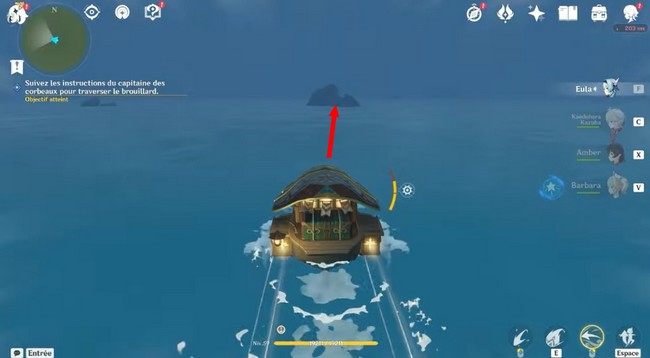 Montez à bord de la barge et dirigez-vous vers le nord à partir de l’emplacement actuel et passez à travers les rochers selon un schéma donné pour trouver l’île de la brume.